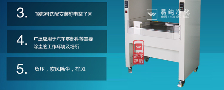 下部吸風(fēng):在工作區(qū)的物品表面的塵埃被吹落后要及時(shí)的被吸收,避免塵埃在工作區(qū)內(nèi)循環(huán)造成污染。臺(tái)面下方設(shè)置成排風(fēng)成,風(fēng)機(jī)上部有中效過(guò)濾袋進(jìn)行吸收,將塵埃收集于此。中效過(guò)濾袋可清洗且可更換。